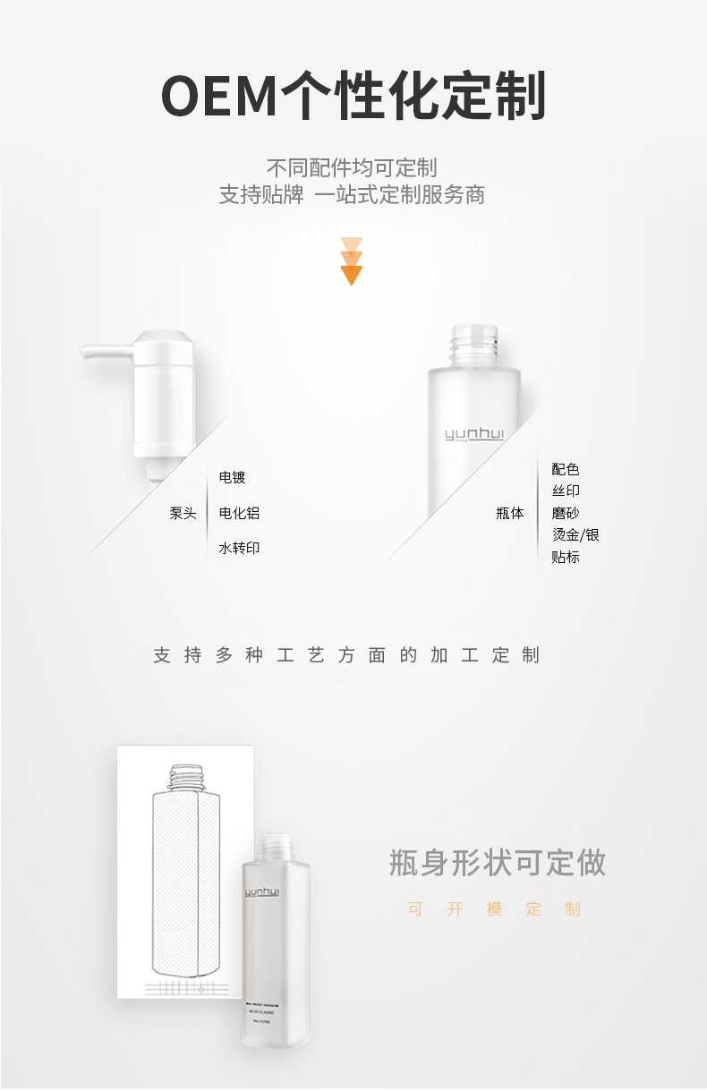 專業(yè)生產(chǎn)高端化妝品包裝瓶、洗護(hù)用品包裝瓶、日化品包裝瓶、護(hù)膚品包裝瓶的廠家